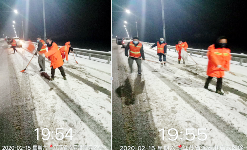 2月15日晚18:00時(shí),徐圩悅升公司班子成員及各分公司黨政負(fù)責(zé)人全員出動(dòng),帶領(lǐng)18名突擊隊(duì)員快速趕赴新區(qū)上海路、徐圩大道、徐新路、金港路等主要交通要道,連續(xù)奮戰(zhàn)4個(gè)多小時(shí),對(duì)橋梁、彎道等重點(diǎn)防滑路段進(jìn)行清雪防凍處理,共鋪灑融雪劑10余噸?!跋愫忧榫墶⑿腋<覉@”兩個(gè)職工小區(qū)防控疫情值守人員,不懼嚴(yán)寒,冒著大雪,在小區(qū)加強(qiáng)巡邏防控。該公司應(yīng)急大隊(duì)按照徐圩新區(qū)防疫指揮部要求,配合社區(qū)對(duì)珠江鋼管相關(guān)路道進(jìn)行封閉管控。