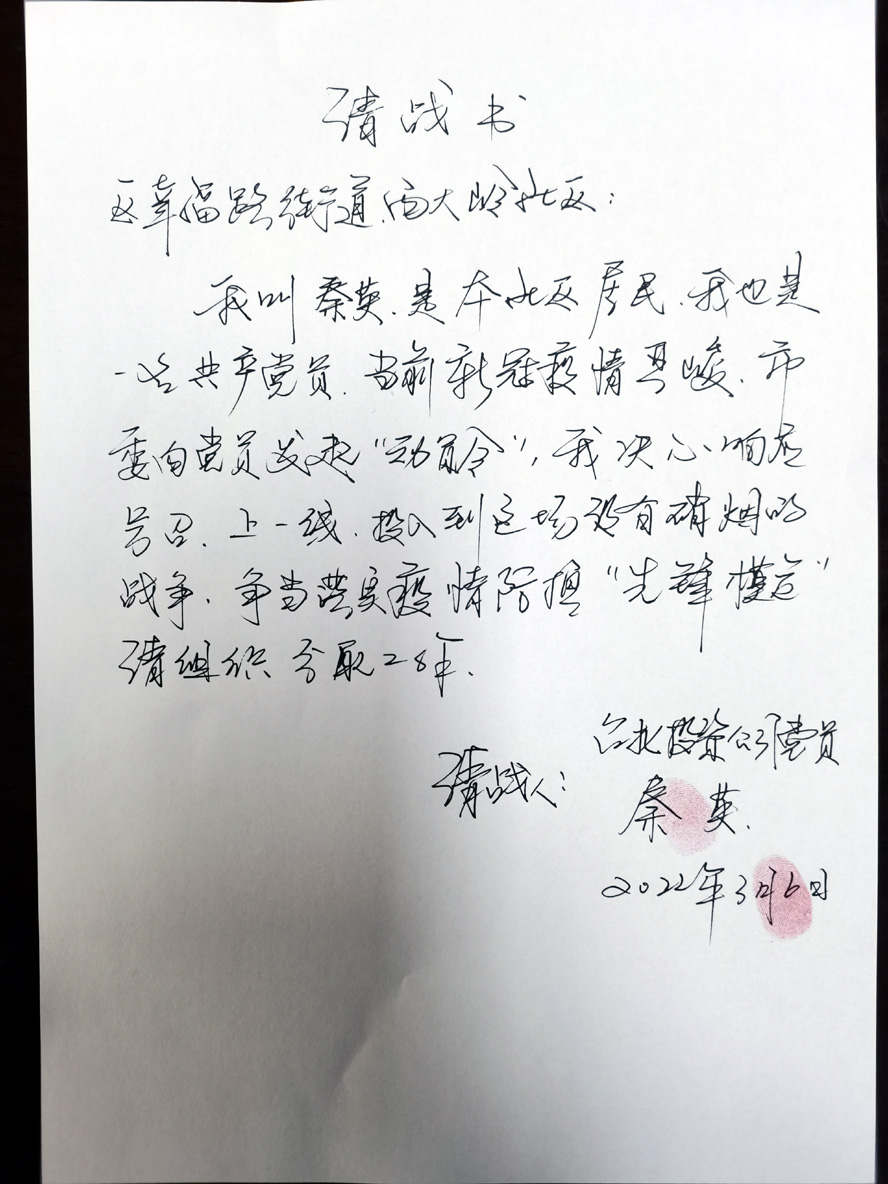 隨著市政府的快速響應(yīng),不到中午就開始全區(qū)核酸檢測(cè),突地一下工作人員不夠用了?!耙咔榫褪敲?,防控就是責(zé)任”,秦英主動(dòng)聯(lián)系海州區(qū)幸福路街道西大嶺社區(qū),在咨詢志愿者報(bào)名的同時(shí),鄭重地并向社區(qū)遞交了一份疫情防控“請(qǐng)戰(zhàn)書”。與此同時(shí),她還動(dòng)員她所在的“工投舞蹈隊(duì)”一幫姐妹,迅速成立一支抗疫志愿者隊(duì)伍,自發(fā)維護(hù)小區(qū)防控秩序,參與小區(qū)噴灑消毒、衛(wèi)生清掃、鄰居物資代購(gòu)、心理疏導(dǎo)等工作中。幾千人的小區(qū)在她的感染帶動(dòng)下,擰成一股繩、攥成一個(gè)拳,群防群控,筑起一道廣泛堅(jiān)實(shí)的防疫戰(zhàn)線。