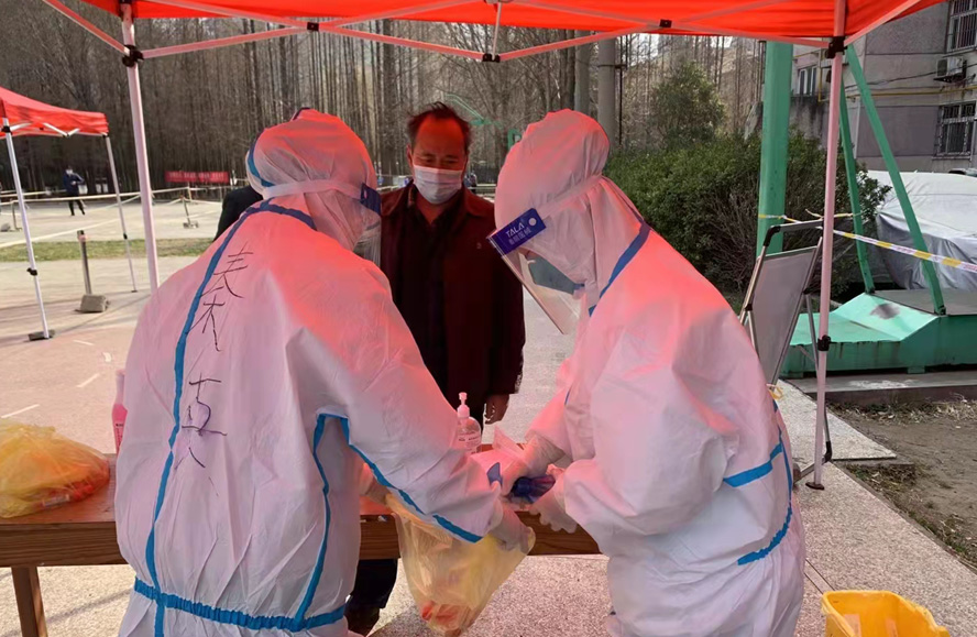 然而隨著疫情愈發(fā)嚴(yán)重,小區(qū)核酸檢測(cè)員人手又緊張了起來(lái),“我可以,這幾天我都學(xué)會(huì)了,最基本的我都會(huì)”秦英又是第一個(gè)舉手到最前線。這下她更忙了,每天凌晨三點(diǎn)起床做飯,五點(diǎn)社區(qū)報(bào)到,一直堅(jiān)守到晚上八點(diǎn)。為了節(jié)省防護(hù)服,她一般都要等到中午2點(diǎn)多鐘才休息吃飯,這股毅力讓社區(qū)、街道領(lǐng)導(dǎo)看在眼里、服在心上,連一直牢騷怪話的幾個(gè)群眾也為她由衷地豎起大拇指。
