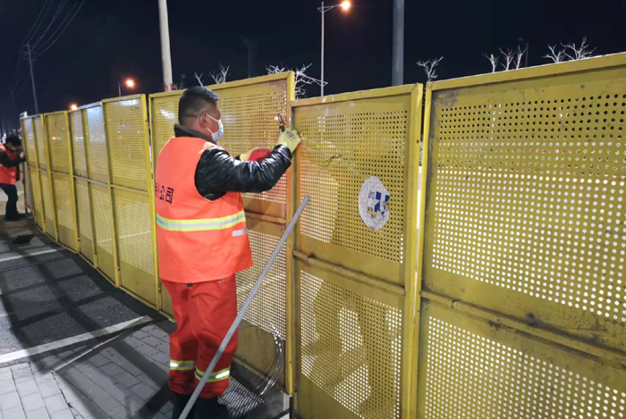 疫情就是命令,防控就是責任,容不得半刻的拖沓。3月5日晚,市政分公司接到圍擋安裝工程任務后,該公司黨員骨干8名突擊隊員第一時間趕到新區(qū)方洋路、環(huán)保十路相關路口。突擊隊克服夜晚視線不好、氣溫較低等客觀困難,加班加點進行圍擋安裝,歷經(jīng)大家3個多小時的突擊工作,完成安裝任務。連日來,面對肆意襲來的疫情,工作人員白天黑夜連軸轉(zhuǎn),任勞任怨,無怨無悔,放棄中午休息,路邊解決餐飲,在每一個時間節(jié)點按時完成各項安裝任務,工作人員用汗水筑起“防疫鐵壁”,讓疫情“無路可逃”。
