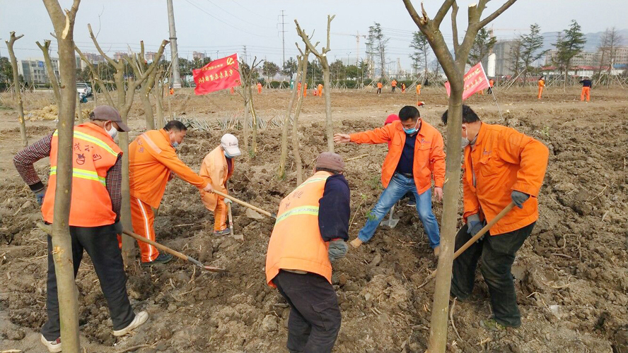 為保證植樹(shù)質(zhì)量,該公司配備多名專(zhuān)業(yè)技術(shù)人員進(jìn)行全程技術(shù)指導(dǎo)。上午8時(shí)許,在移苗現(xiàn)場(chǎng),一臺(tái)挖掘機(jī)轟隆隆地作業(yè)著,小心翼翼的將一棵棵大樹(shù)苗連根拔起,在保證不擠壓的情況下,輕抬輕放,裝苗運(yùn)輸。在栽苗活動(dòng)現(xiàn)場(chǎng),全體工作人員戴好頭罩、手套等防護(hù)用具,在統(tǒng)一指揮下,彼此間隔1米左右,擼起袖子、揮著鐵鍬、扛著鋤頭飛快地投入到栽苗植樹(shù)作業(yè)中。大家分工協(xié)作,有的開(kāi)槽挖坑;有的栽植樹(shù)苗;有的抬木扶苗;有的回填新土;有的纏繩護(hù)樹(shù);有的澆水保濕……到處都是忙碌的身影,整個(gè)植樹(shù)活動(dòng)現(xiàn)場(chǎng)一片熱火朝天的繁忙景象。放眼望去,在明媚的春光中,一排排新栽下的樹(shù)苗迎風(fēng)挺立,生機(jī)勃勃,組成了一道道靚麗的風(fēng)景線。