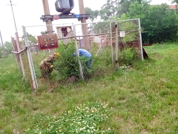 清理外置的變電設(shè)備周?chē)h(huán)境。通過(guò)夏季雨水的滋潤(rùn),外置的變電設(shè)備周?chē)L(zhǎng)滿了鹽蒿、蔓草和蘆葦。有的地方雜草叢生人不能進(jìn)入給維護(hù)造成困難,有的地方蔓草越過(guò)圍欄直接爬上電桿威脅線路安全,有的直接被淹沒(méi)在蘆葦叢中,不見(jiàn)了蹤影,給變電設(shè)備的環(huán)境帶來(lái)惡化和安全隱患。為此,供電所組織人員進(jìn)行全面清理,完成了16處外置的變電設(shè)備清理工作。