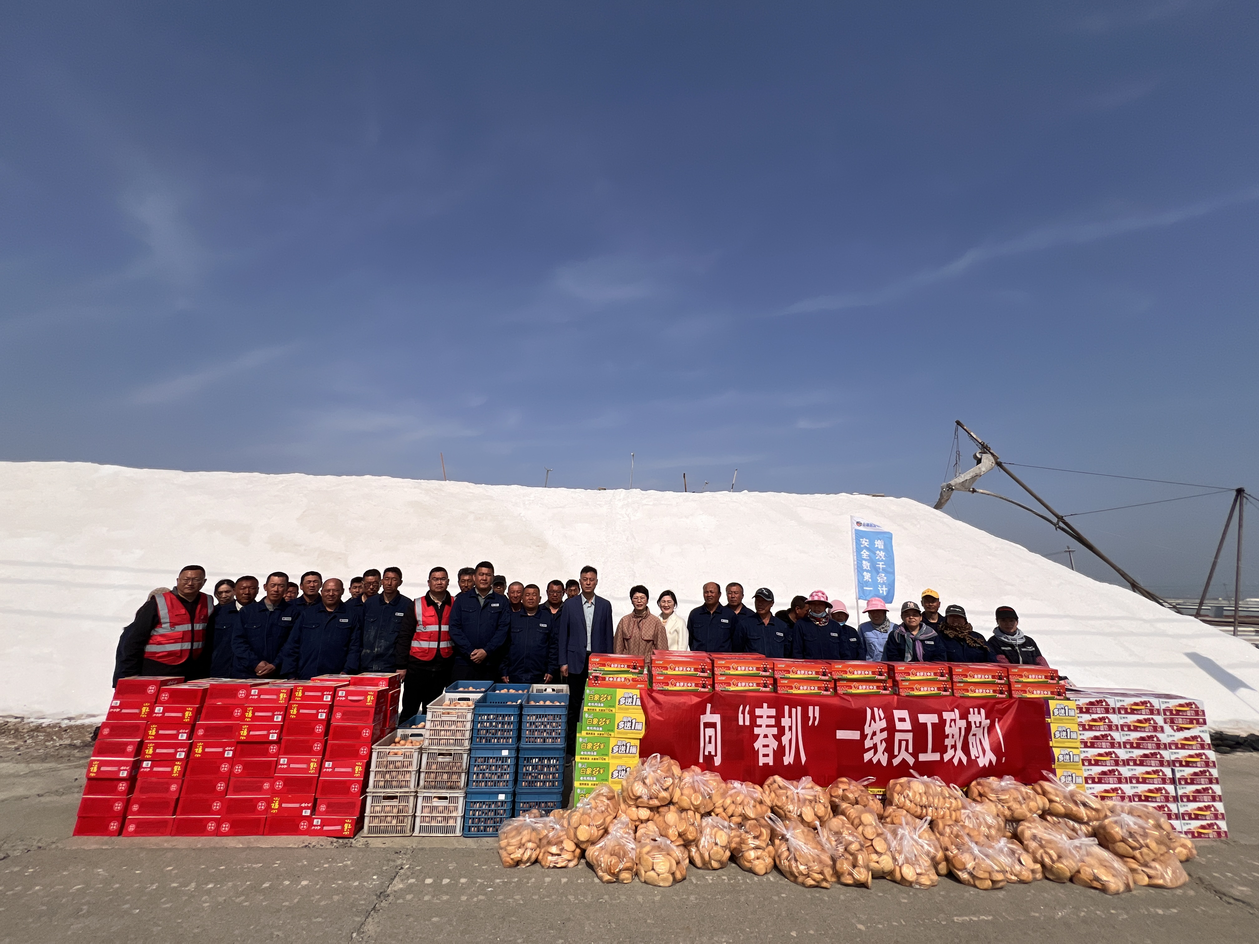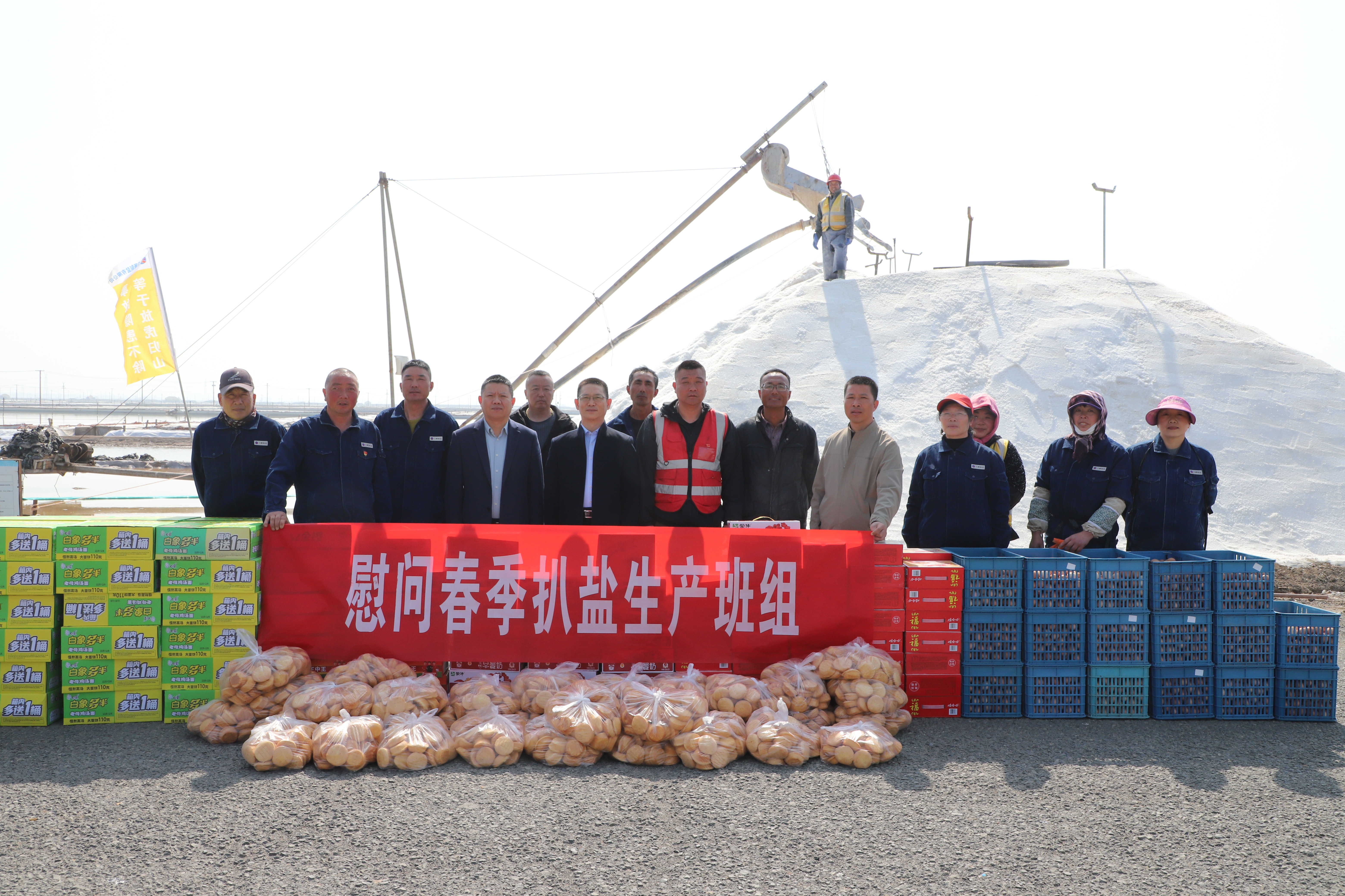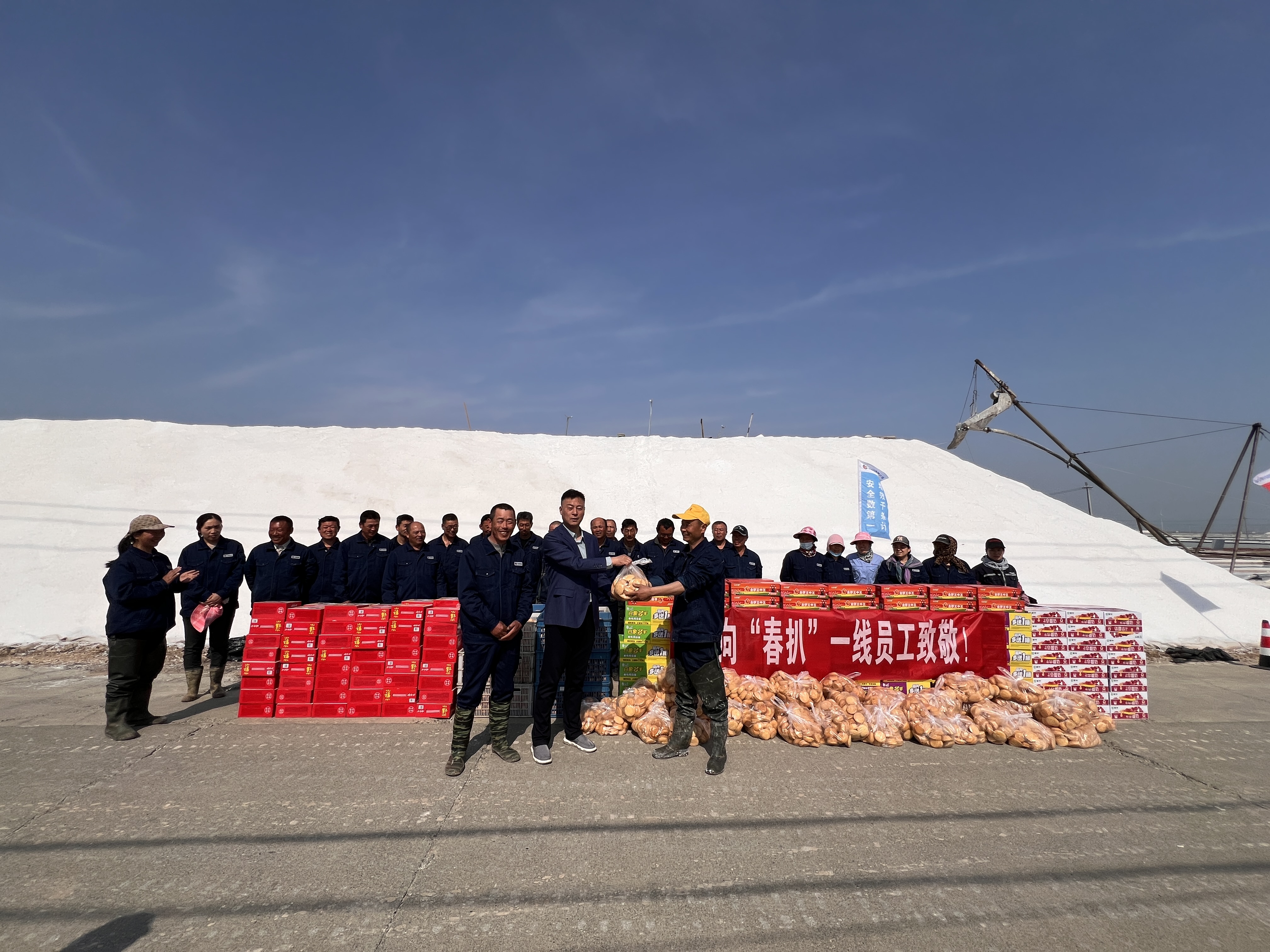 “你們辛苦了,我代表公司來(lái)看望大家。”在新河十班與埒南十一班,吳衛(wèi)平與扒鹽現(xiàn)場(chǎng)職工握手問(wèn)好,感謝他們?cè)谶^(guò)去的一年為日曬制鹽公司的原鹽生產(chǎn)所付出的辛勤努力,叮囑他們一定要落實(shí)落細(xì)扒鹽生產(chǎn)措施,增強(qiáng)責(zé)任感和警覺(jué)性,嚴(yán)格執(zhí)行各項(xiàng)規(guī)章制度,切實(shí)保障扒鹽期間的安全生產(chǎn),并送上雞蛋、八寶粥、方便面、牛奶等物品。
