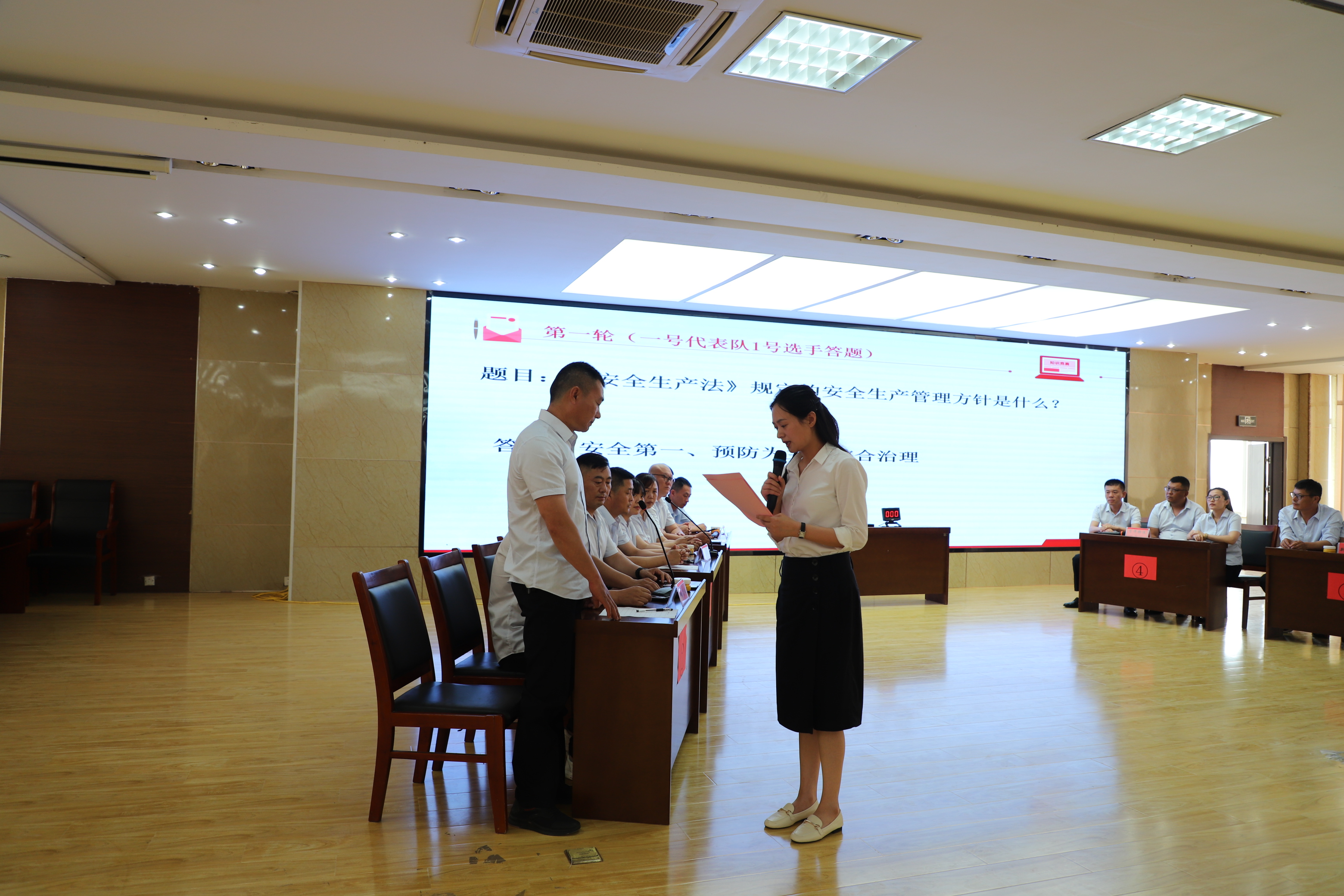 來(lái)自各單位的6支代表隊(duì)參加比賽,比賽在必答題、“看圖找錯(cuò)”、風(fēng)險(xiǎn)題、搶答等五個(gè)環(huán)節(jié)中展開(kāi)角逐,活動(dòng)現(xiàn)場(chǎng),各代表隊(duì)選手自信滿滿、胸有成竹、干脆利落地進(jìn)行答題,在一次又一次“手速”與“腦力”中比拼,比分你追我趕,不相上下。特別是在風(fēng)險(xiǎn)題環(huán)節(jié),由于可供各代表隊(duì)選擇的答題難易程度、風(fēng)險(xiǎn)程度和與之相應(yīng)的分值懸殊明顯,各代表隊(duì)更是來(lái)了一場(chǎng)戰(zhàn)術(shù)與策略的較量,整場(chǎng)比賽氣氛熱烈、高潮迭起、精彩紛呈,臺(tái)下觀眾不時(shí)爆發(fā)出熱烈掌聲。