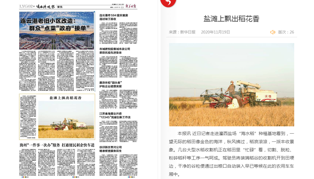 近日記者走進(jìn)灌西鹽場“海水稻”種植基地看到,一望無際的稻田像金色的海洋,秋風(fēng)拂過,稻浪滾滾,一派豐收景象。幾臺大型水稻收割機(jī)正在稻田里“忙碌”著,切割、脫粒、粉碎稻稈等工序一氣呵成。駕駛員將裝滿稻谷的收割機(jī)開到田埂邊,干凈的谷粒便通過出糧口自動裝入早已等候在此的農(nóng)用車車廂中。