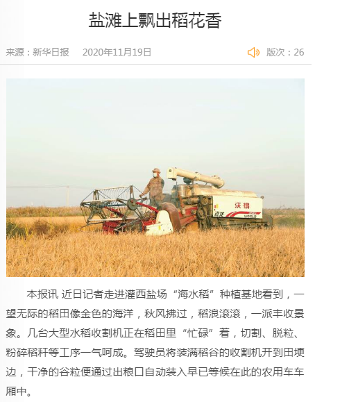 正在收割的這片單季“海水稻”稻田有200多畝,去年剛復(fù)墾完成,鹽度在5‰左右,屬于鹽度偏高的鹽堿地。今年試種的單季水稻有470多畝,選取耐鹽度較好的“南粳9108”水稻品種,每畝產(chǎn)量預(yù)計800斤左右。