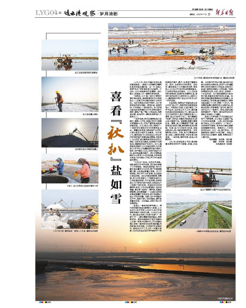 扒鹽現(xiàn)場,指揮生產(chǎn)的程龍是土生土長的“鹽三代”,爸爸和爺爺都是老鹽場人。“和鹽場打交道,心里才踏實(shí)。”大學(xué)畢業(yè)后,在外地工作了幾年,程龍最終還是決定回到鹽場工作。程龍說,純手工扒鹽的年代,鹽工們都很辛苦——春季,鹽工們迎來“大忙”。他們需要防“地漏”,用石拱、壓割機(jī)把池底壓實(shí),防止鹵水滲透下去。緊接著,就要忙春季扒鹽。夏季,鹽工們需要防“天漏”,提前將鹵水放進(jìn)土塘,避免降雨將鹵水稀釋。秋季,鹽工們開始手工扒鹽,用扁擔(dān)挑鹵水,用小推車把曬好的鹽一車車推到船上運(yùn)走。冬季,鹽工們需要對溝道、池埝、土塘進(jìn)行修復(fù),為來年春天做準(zhǔn)備。一年四季,循環(huán)往復(fù),鹽場人辛勤勞作。