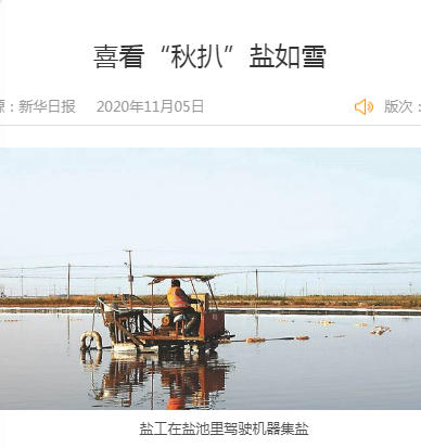 10月22日,在位于灌云縣東北角的灌西鹽場,一名鹽工正開著電動履帶扒鹽機(jī)在鹽池里扒鹽。這一天,鹽場人簡稱“秋扒”的秋季扒鹽已近尾聲。不遠(yuǎn)處,7000噸鹽堆成的鹽廩像一座小雪山,那是鹽工們一星期的勞動成果。