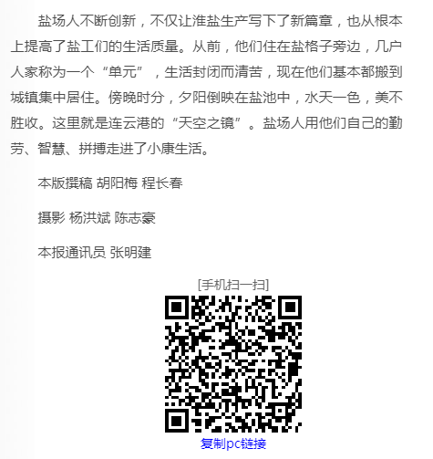 鹽場人不斷創(chuàng)新,不僅讓淮鹽生產(chǎn)寫下了新篇章,也從根本上提高了鹽工們的生活質(zhì)量。從前,他們住在鹽格子旁邊,幾戶人家稱為一個“單元”,生活封閉而清苦,現(xiàn)在他們基本都搬到城鎮(zhèn)集中居住。傍晚時分,夕陽倒映在鹽池中,水天一色,美不勝收。這里就是連云港的“天空之鏡”。鹽場人用他們自己的勤勞、智慧、拼搏走進(jìn)了小康生活。