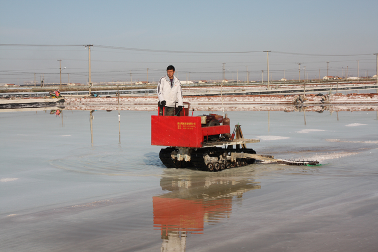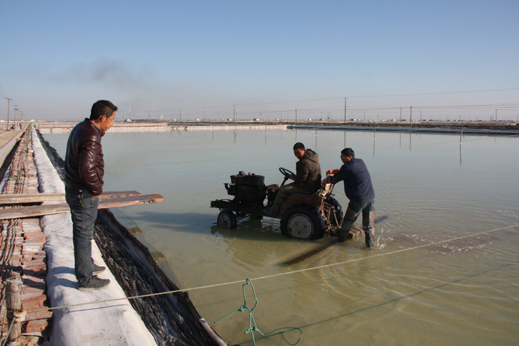 在埒南制鹽分公司的八班,我們看到一名工人正熟練操作著一臺(tái)整平機(jī)械在結(jié)晶池內(nèi)來(lái)回移動(dòng),對(duì)扒過(guò)鹽的格塊進(jìn)行整平,還有幾名工人用鐵锨整平機(jī)械到不了的邊角地帶。由于在廩基上沒(méi)有看到鹽,而結(jié)晶池已扒過(guò)鹽,我們覺(jué)得奇怪,經(jīng)了解,原來(lái)今年新扒鹽已經(jīng)有部分銷(xiāo)售了出去。埒南制鹽分公司經(jīng)理?xiàng)钍乇诰虐嗟臑┥喜榭礄C(jī)械破碴情況,他說(shuō)道:“我們以委員包片形式深入班組貫徹公司職代會(huì)精神,加強(qiáng)形勢(shì)任務(wù)宣傳統(tǒng)一思想,讓員工認(rèn)識(shí)到當(dāng)前原鹽市場(chǎng)回暖行情,鼓舞士氣,振奮精神,全力投入到當(dāng)前春季生產(chǎn)中來(lái)。”