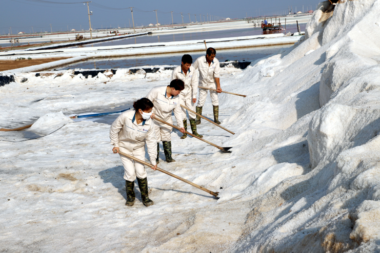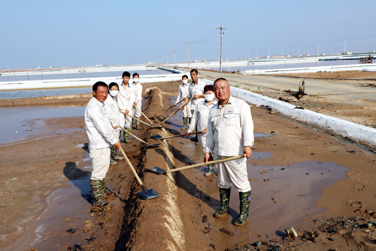 趁著休息的間隙,筆者與身邊忙得滿頭大汗的8班班長祝星星聊了起來。據(jù)祝星星介紹,每天員工4點半就到灘頭,進行鹽池的人工活碴、稟基修復(fù)、鹽池鹵水補充、收放設(shè)備檢查等一系列工作,因此,合理安排工作量非常重要。他告訴筆者,室外工作工人的勞保服比較厚,一天下來工作服濕了又干,干了又濕,衣服上都泛出厚厚的鹽漬。一天下來,全班要消耗2大桶甚至更多的飲用水。現(xiàn)在公司里對我們一線生產(chǎn)崗位員工非常關(guān)心,防暑降溫工作非常到位。最近,單位又為我們發(fā)放高溫津貼、電風(fēng)扇、防暑降溫藥品。這些讓我們員工真切感受到組織的力量,組織得偉大,所以雖說現(xiàn)在比平時更辛苦,我們有信心戰(zhàn)高溫、奪高產(chǎn)。