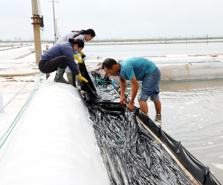 8月15日早,在制鹵區(qū)2班,班長王春好帶著班組的工人準(zhǔn)備干活,安排好每個人的工作后,大家拿起工具上灘,工人們分散開來,各自忙著手里的活。工人們前后排開,彎腰俯身,用鐵鍬挖溝做堰,為下雨排淡水做好準(zhǔn)備。“踩在鹵水里能感覺像是在“燙腳”,太陽把鹵水曬的滾燙的。”領(lǐng)灘手王春好用衣袖擦著臉上的汗水說,自己在灘上干了有七、八年了,對于這樣的工作環(huán)境已經(jīng)適應(yīng)了。進(jìn)入八月以來,連續(xù)7天最高溫度達(dá)到35以上,臺風(fēng)過后,今天的氣溫也達(dá)到了33度,令今年這個夏天,成為有完整氣象記錄最熱的夏天。跑水工仇海濱,到灘上一個多小時,以是大汗淋漓,他帶領(lǐng)工人做一些修堰、補(bǔ)塑布、緊繩、還有查跑道頭的活。