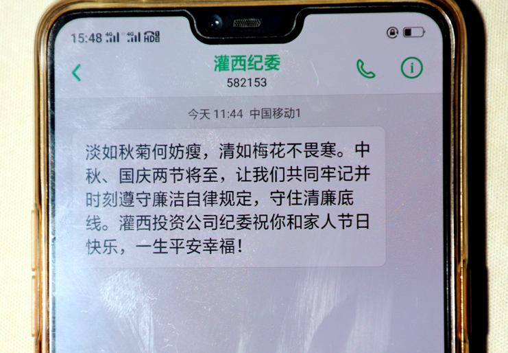 群發(fā)一條廉政提醒短信。以“灌西紀(jì)委”名義向全公司黨員干部普發(fā)“廉政短信”。向黨員領(lǐng)導(dǎo)發(fā)送廉政短信‘拉袖子 、敲警鐘’,以提醒黨員干部“嚴(yán)格執(zhí)行廉潔從政各項(xiàng)規(guī)定,‘反四風(fēng)’、樹新風(fēng),廉潔文明過(guò)佳節(jié)”,不僅提醒黨員干部做好廉潔帶頭人,更重要的是提醒廣大領(lǐng)導(dǎo)干部要牢記黨風(fēng)廉政建設(shè)兩個(gè)責(zé)任,在落實(shí)責(zé)任上要有主動(dòng)擔(dān)當(dāng)!