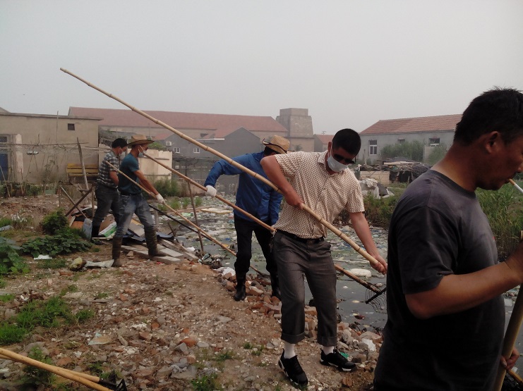 大家早上7點集合后到所在負責片區(qū):化工區(qū)家屬區(qū)北面的河邊,用耙子打撈河中垃圾。大家不顧高溫天氣、垃圾長期在河中腐蝕的異味,用大耙撈,小耙拉,將河中的垃圾運上來。河中懸浮生長的雜草最難清理,大家齊心協力,用木筏撐著,找繩子拉,經過一上午的忙碌,垃圾被清理了,河道暢通了,為居民創(chuàng)造了整潔的環(huán)境,更為雨季到來時河道的排淡能力發(fā)揮了較大的作用。