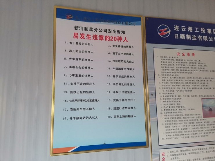 4月25日,新河制鹽分公司對(duì)16個(gè)產(chǎn)鹽班組安全活動(dòng)室加裝安全告知牌,這是該公司防范人為因素造成安全事故,確保安全生產(chǎn)形勢(shì)穩(wěn)定采取的措施之一。