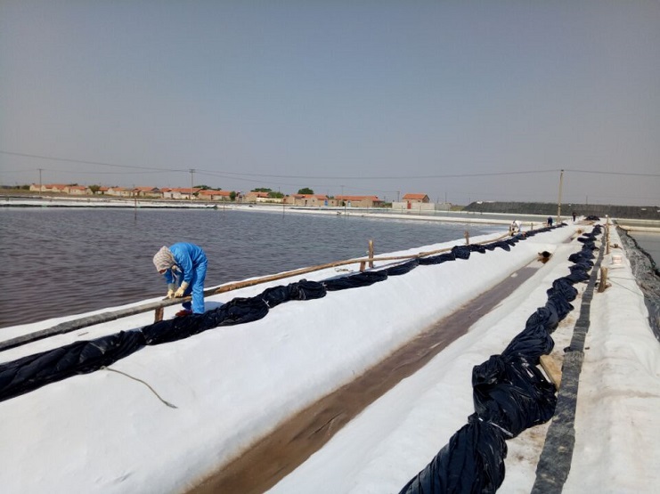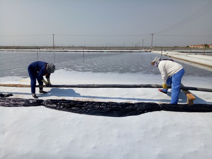 實業(yè)公司制鹽分公司、海鹽基地灘場文明建設(shè)正在進行中。 分公司海鹽基地二班近階段正在上塑布。班組全員先壓浮板、裹浮板、釘老樁,裝布,目前該班組已上塑布三塊六十公畝,計劃上九塊一百八十公畝。(實業(yè)公司)