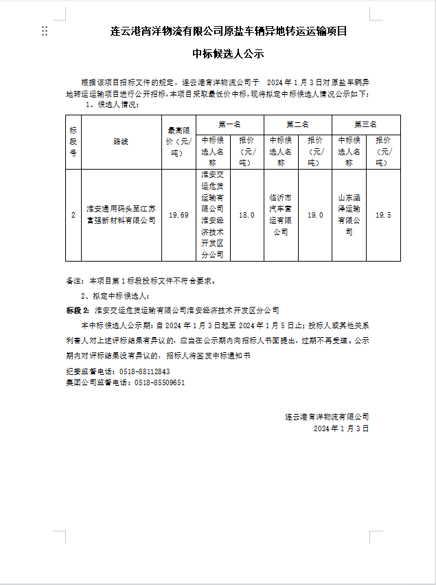 連云港宵洋物流有限公司原鹽車(chē)輛異地轉(zhuǎn)運(yùn)運(yùn)輸項(xiàng)目中標(biāo)候選人公示