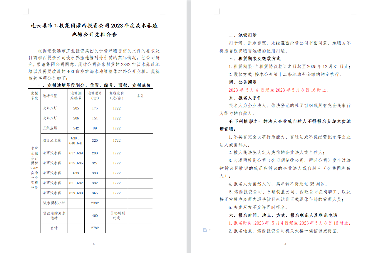 連云港市工投集團灌西投資公司2023年度淡水養(yǎng)殖池塘公開競租公告