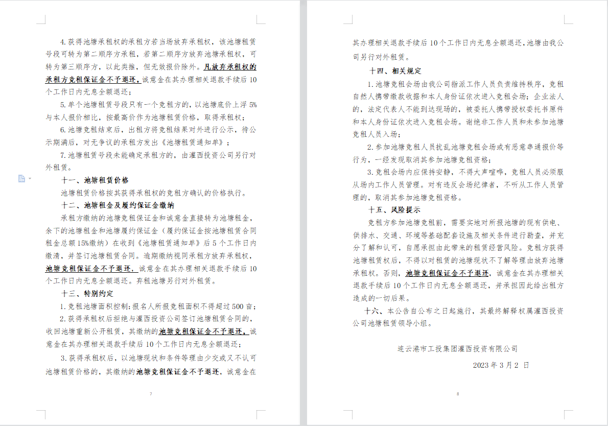 連云港市工投集團(tuán)灌西投資公司2023年度淡水養(yǎng)殖池塘公開競租公告