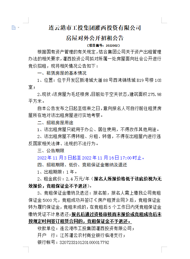 連云港市工投集團(tuán)灌西投資有限公司房屋對(duì)外公開招租公告