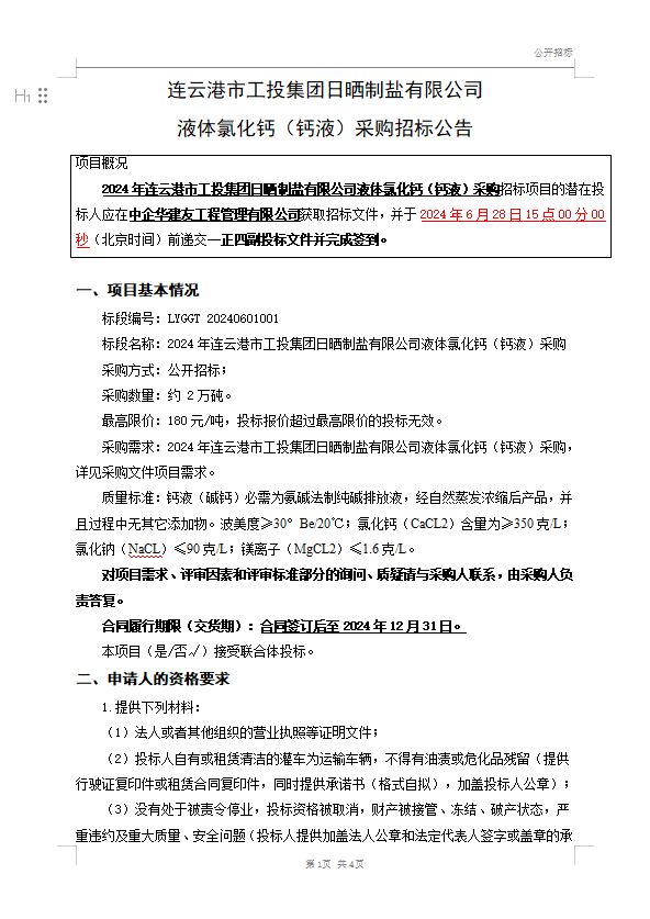 日曬制鹽公司 液體氯化鈣(鈣液)采購招標(biāo)公告