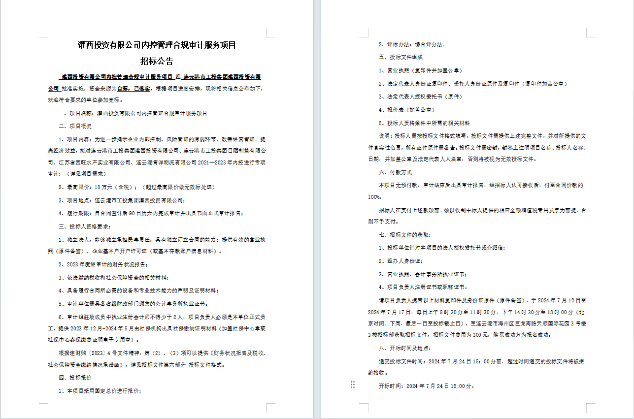 灌西投資有限公司內(nèi)控管理合規(guī)審計(jì)服務(wù)項(xiàng)目招標(biāo)公告