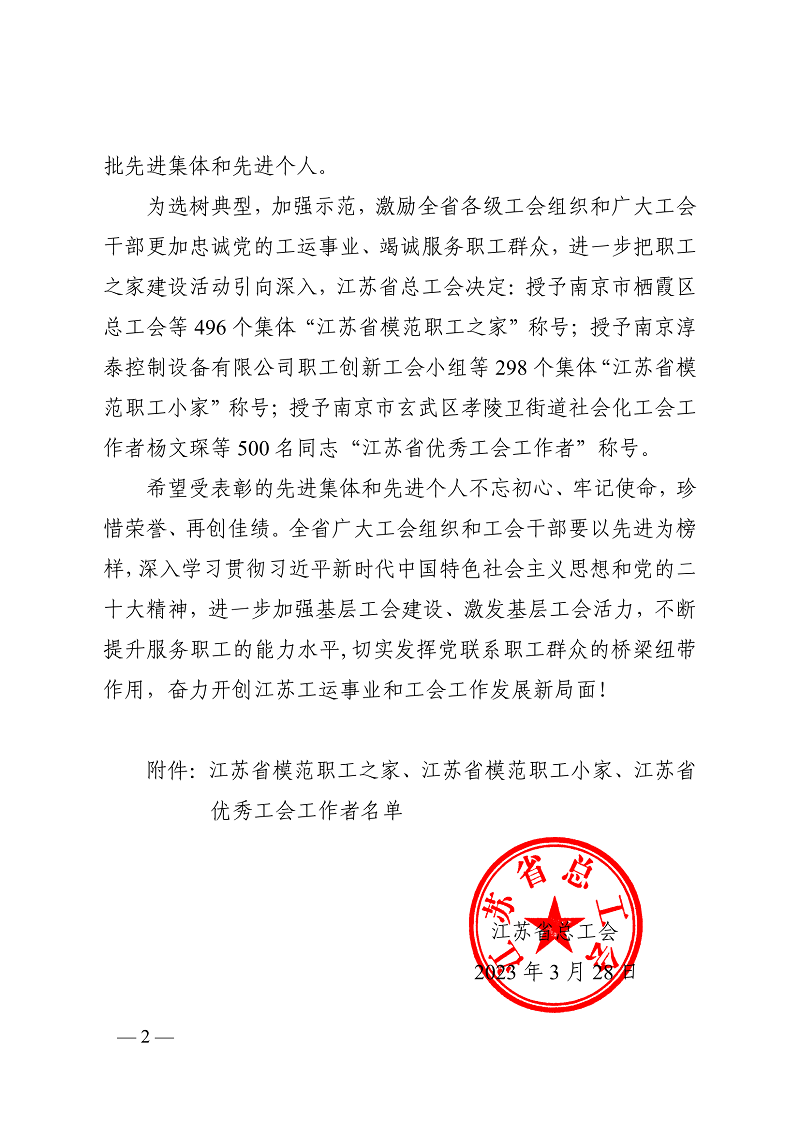 根據(jù)《江蘇省總工會(huì)關(guān)于表彰省模范職工之家、模范職工小家、優(yōu)秀工會(huì)工作者的決定》(蘇工發(fā)【2023】4號(hào))文件精神,青口投資公司工會(huì)榮獲“江蘇省模范職工之家”稱號(hào)。
