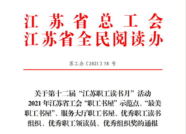 近日,江蘇省總工會、江蘇省全民閱讀辦聯(lián)合下發(fā)《關(guān)于第十二屆“江蘇職工讀書月”活動通報》(蘇工辦【2021】58號)文中,我公司職工書屋獲評2021年度江蘇省工會“職工書屋”示范點(diǎn),同時獲贈圖書近200冊。
