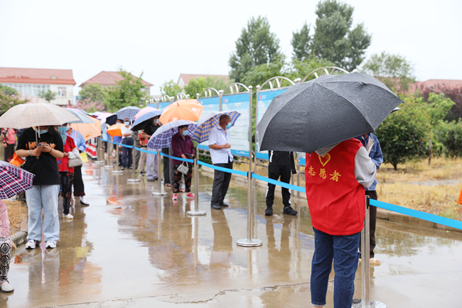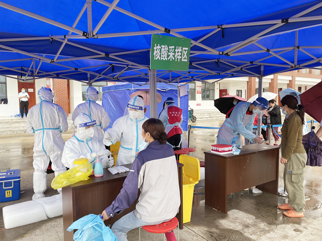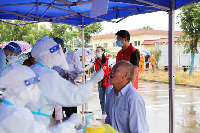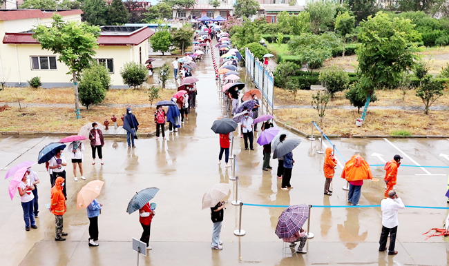 “黨旗飄在一線、堡壘筑在一線、黨員沖在一線”。核酸檢測(cè)現(xiàn)場(chǎng),來(lái)自青口公司黨員志愿者在現(xiàn)場(chǎng)為職工群眾提供相關(guān)咨詢和掃碼指導(dǎo)服務(wù),很多黨員在核檢工作中全身濕透仍在雨中盡力維護(hù)秩序,盡管天氣不作美,但是職工群眾依然按工作人員的指導(dǎo)有序地進(jìn)行核酸檢測(cè)。大雨里,黨員紅、醫(yī)護(hù)白顯得格外耀眼。(仲偉彬)