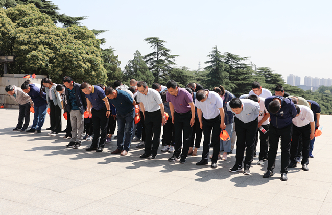 在烈士紀念塔前,公司黨委副書記梁永帶領(lǐng)全體黨員向淮海戰(zhàn)役烈士敬獻花籃,并三鞠躬。