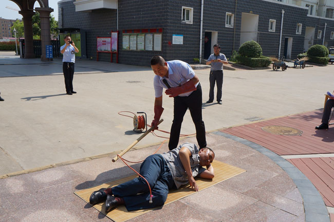 ? ? ? ? ?本次演練模擬一名物業(yè)維修人員施工不慎碰到裸露的電線,導致觸電倒地。在演練現場,專業(yè)電工、醫(yī)護人員先向觀摩人員詳細講解了觸電急救、人工呼吸及胸外心臟擠壓等救援理論知識,并進行施救演示。經過 20多分鐘的演練,順利完成了演練任務。演練結束后,安全技術部負責人對演練情況進行綜合點評,并對泰祥員工安全知識進行培訓,泰祥公司現場發(fā)放了安全用電小常識等宣傳材料。通過此次演練使員工對觸電事故的應急救援步驟和方法有了更深的認識,進一步提高職工觸電急救的能力,有效地提高了職工防范安全風險的意識。