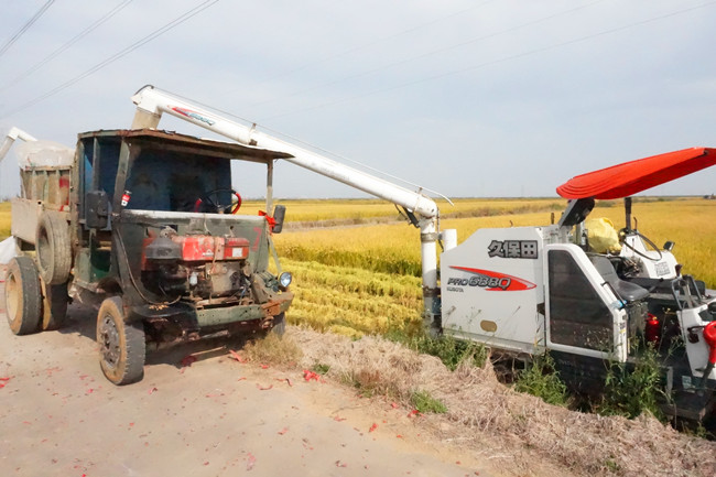 10月25日,天氣晴好。四臺收割機(jī)伴隨著喜慶的爆竹聲陸續(xù)開進(jìn)稻田,拉開了大新農(nóng)場萬畝稻田開鐮序幕。黨委委員、副總經(jīng)理周緒祥在現(xiàn)場查看指揮。