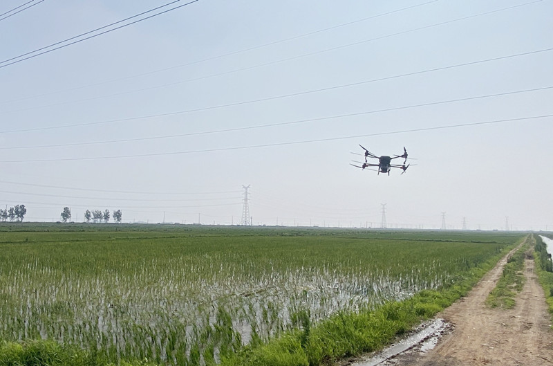 近日,大新農(nóng)場采用無人機(jī)適時開展追施返青肥,每天每臺施肥約400畝,節(jié)約人工成本,且噴灑均勻,保證水稻秧苗移栽后能夠及時返青,促進(jìn)秧苗早分蘗。(大新農(nóng)場)