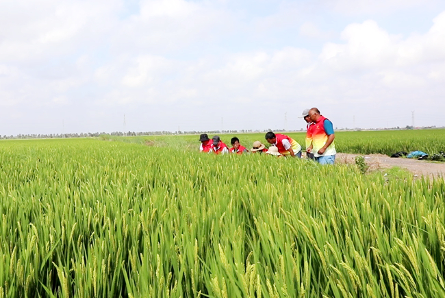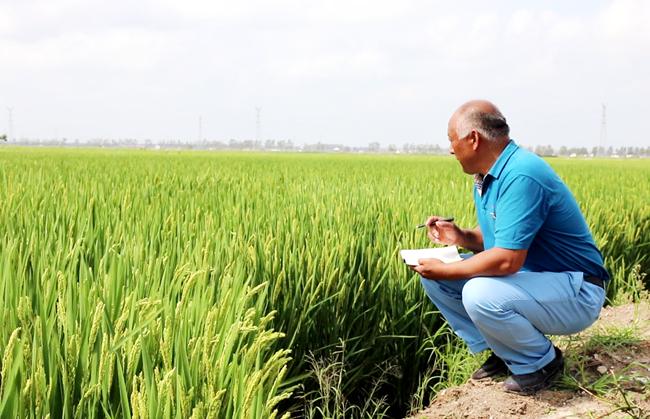 2013年,趙華兵種植大新農(nóng)場520畝水稻田,這是在鹽田里種植水稻,實行“以種代改”,這是他投身公司水稻自種自營模式的第一年。為了仔細照看咸土地上的“鹽田寶貝”,他日夜穿梭在田間地頭。要想種好水稻,沒有巧勁,關鍵是要舍得跑,有不怕吃苦、敢于吃苦奉獻的精神。趙華兵育秧蹲點、走田頭、查病蟲,經(jīng)常是風天一身土,雨天一身泥。