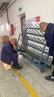 維修臺(tái)車時(shí),我當(dāng)起了孫師傅的下手,一邊將臺(tái)車穩(wěn)住不能傾倒,一邊看著孫師傅卸下每個(gè)車輪子并進(jìn)行仔細(xì)清理,不怕臟、不怕累,毫無怨言,一絲不茍,動(dòng)作利落,手法嫻熟,親身直面他的高效率和專業(yè)水平。他還對我詳細(xì)解說,讓我理解每個(gè)步驟的重要性和關(guān)鍵點(diǎn)。我們蔣姐也過來幫忙,不停的清掃臺(tái)車上清理出來的垃圾……