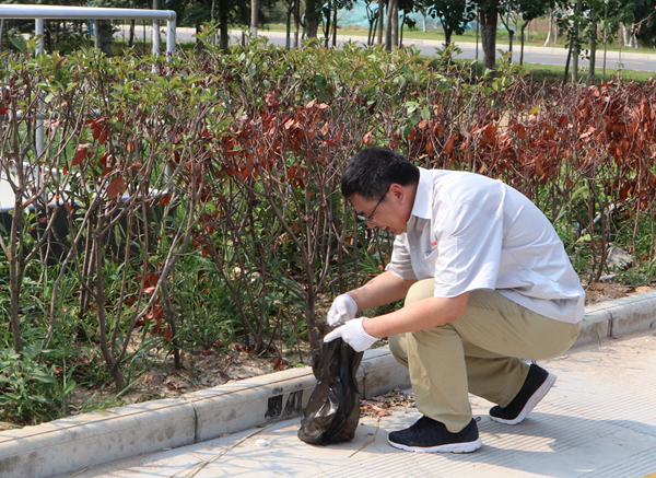 下午的陽光熾熱,女同事們戴著帽子,穿著防嗮服或較厚的秋裝工作服,時(shí)不時(shí)的在陰涼的地方撿垃圾。李總穿著夏裝工作服一直在陽光下,時(shí)而貓著腰,時(shí)而抬起膀子抹一下額頭的汗,身旁的同事喊他到陰涼地休息一下,他笑著說:“沒啥,今天的鈣是補(bǔ)足了”,說著又彎下腰干起活來了。