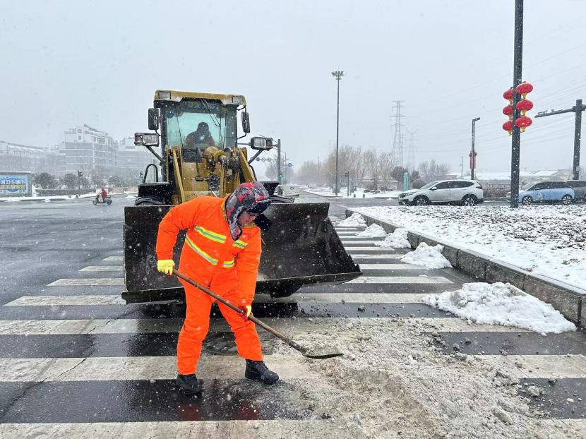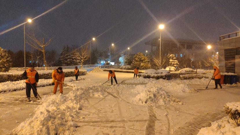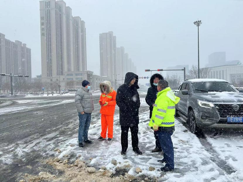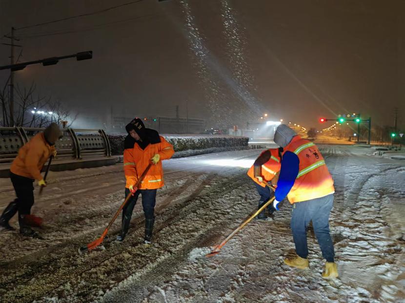 上午10時(shí)許,暴雪如約而至。裝有融雪劑的車輛全部整裝待發(fā),聞令而動(dòng),采取“人工+機(jī)械”不間斷作業(yè)模式,對轄區(qū)主次干道、橋涵、火車站東站、創(chuàng)智大廈等帶坡路段及時(shí)拋撒融雪劑,采取“滾刷+鏟車”組合方式,反復(fù)排掃路面積雪,確保主次干道、帶坡路段通暢無冰。