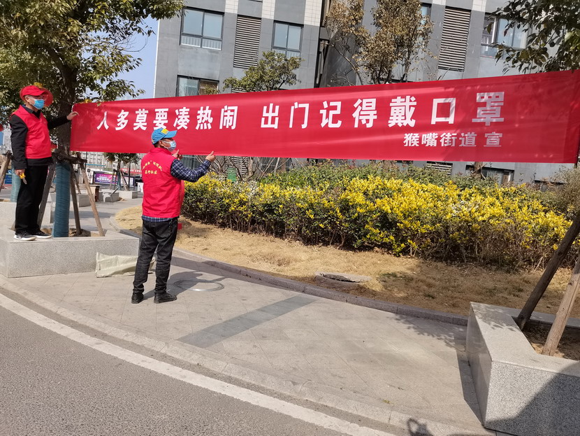 ▲昌圩社區(qū)臨時(shí)黨支部書記李明,黨員骨干于洪亮懸掛疫情宣傳標(biāo)語(yǔ)。
