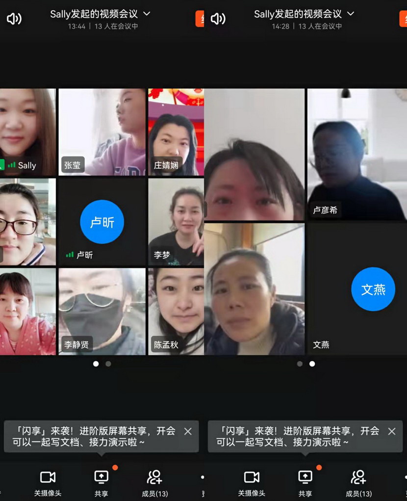 線上貢獻篇。“縱然居家隔離,一樣不防礙我們做貢獻,我們線上服務(wù)已經(jīng)開啟”三八節(jié)這一天,在社區(qū)忙碌一天的公司女工委副主任宋文靜又特意安排了“三八”節(jié)線上活動。這一天活動精彩紛呈:首先是視頻連線,通過廣大女工并向她們家人傳達市委市政府以及集團黨委、投資公司黨委關(guān)于疫情防控文件精神。其次共同學(xué)習(xí)全國“兩會”會議精神。第三,開展公司“三新”解放思想大討論線上論壇,圍繞疫情防控、生產(chǎn)經(jīng)營,尤其是企業(yè)轉(zhuǎn)型發(fā)展出謀劃策。最后還來了點小游戲-成語“飛花令”,給嚴肅的疫情防控增添了一息歡樂的氛圍。