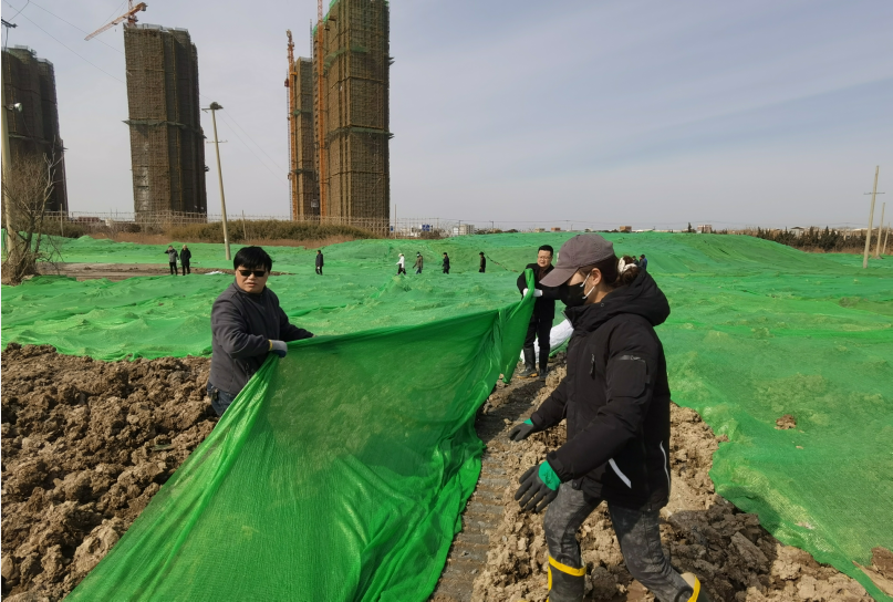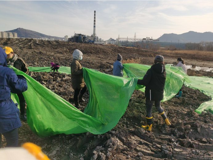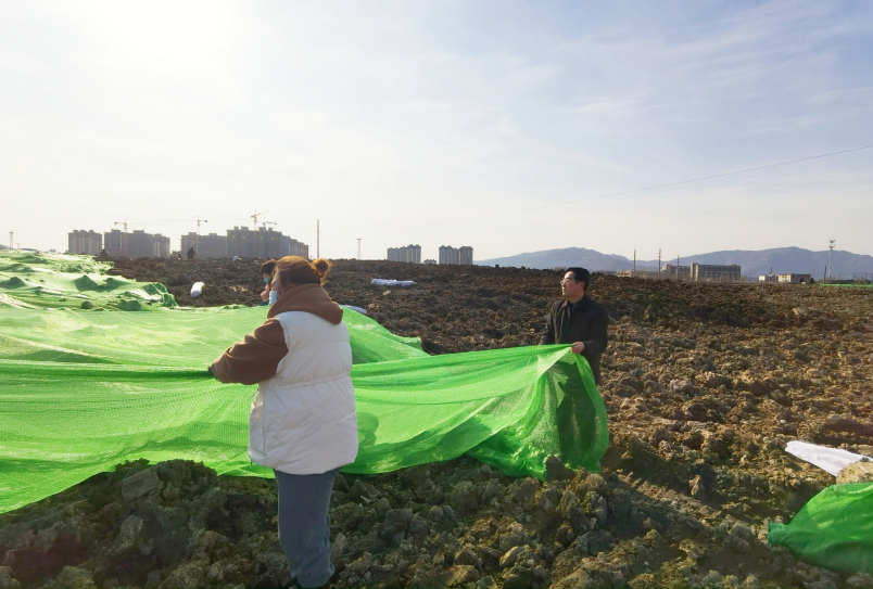 寒冷絲毫沒有降低大家的熱情,路面因為每天噴灑防塵導致潮濕泥濘,大家穿上雨靴,爬上爬下,一鼓作氣,經過兩天齊心協力的辛勤勞作,防塵網終于覆蓋完畢。遠遠望去,覆蓋綠網后的區(qū)域如同覆蓋了一片綠色植被。此次綠網覆蓋行動,不僅抑制了二次揚塵污染環(huán)境,保護了生態(tài)環(huán)境,同時達到了環(huán)境美化的效果。
