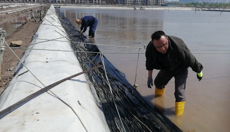 復(fù)曬灘上,昨天冰雹造將擋浪布擊的千瘡百孔,為了保住勞動(dòng)成果,天還未亮?xí)r,翔立人就走上灘頭進(jìn)行搶修更換,以確保利用好天時(shí)退布復(fù)曬生產(chǎn)高濃度鈣液,實(shí)現(xiàn)鈣業(yè)的產(chǎn)銷再創(chuàng)新高。