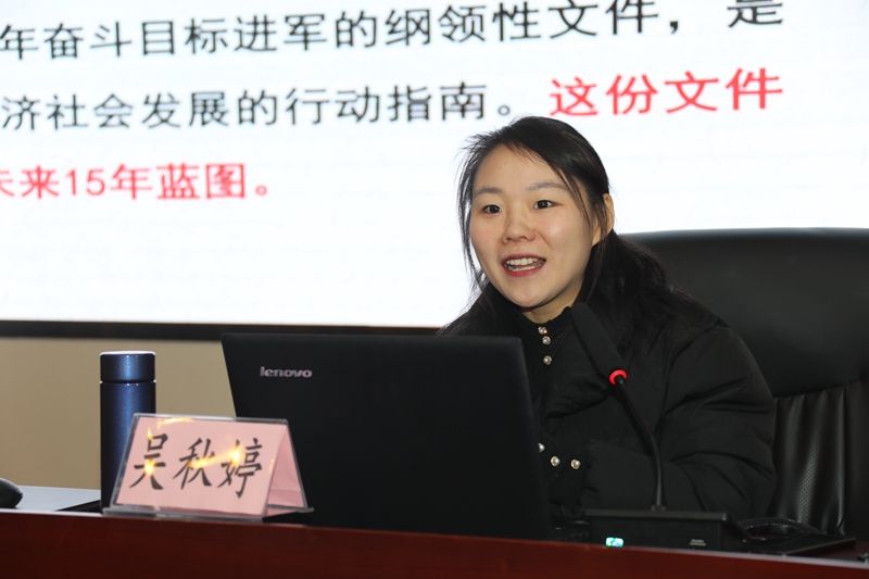 吳秋婷副主任在題為“開啟全面建設(shè)社會主義現(xiàn)代化國家新征程”報告中,從新階段與新目標(biāo)、新理念與新部署、新變化與新格局等三個方面給大家解讀了黨的十九屆五中全會精神?!靶码A段與新目標(biāo)”部分,介紹了我國在決勝全面建成小康社會取得的三大決定性成就,即十三五期間,全面深化改革取得重大突破;經(jīng)濟(jì)實力、科技實力、綜合國力躍上新的大臺階。在“新理念與新部署”部分,從社會發(fā)展、創(chuàng)新發(fā)展、統(tǒng)籌發(fā)展等角度分別提出了習(xí)近平總書記在新時代下對中國共產(chǎn)黨人的要求以及我國社會發(fā)展必須遵循的基本原則。在“新變化與新格局“部分,強(qiáng)調(diào)實現(xiàn)“十四五”規(guī)劃和2035年遠(yuǎn)景目標(biāo)意義重大、任務(wù)艱巨,但是前景光明,全黨全國各族人民要緊密團(tuán)結(jié)在以習(xí)近平同志為核心的黨中央周圍,同心同德,頑強(qiáng)奮斗,積極響應(yīng)十九屆五中全會對全黨全國人民的號召,奪取全面建設(shè)社會主義現(xiàn)代化國家的勝利。