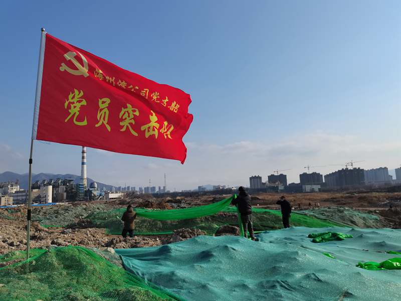 1月20日,在臨達(dá)公司330畝貨場(chǎng)的一處“山丘”上,一面鮮紅的海州灣黨支部“黨員突擊隊(duì)”旗格外引人注目。當(dāng)天中午12時(shí),聽(tīng)聞兄弟單位臨達(dá)公司急需人手苫蓋防塵網(wǎng),支部書(shū)記劉天義一聲令下,海州灣“黨員突擊隊(duì)”立即集結(jié),穿戴好勞動(dòng)裝備,奔赴環(huán)境整治“主戰(zhàn)場(chǎng)”。