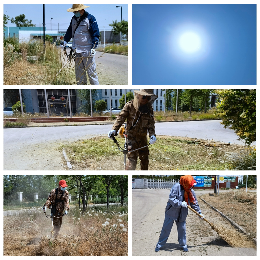頭頂著炎炎烈日、忍受著蚊蟲叮咬,大伙使用打草機、鐮刀等工具,對雜草、高草進行割除。走近細看,他們的臉上和手臂上都布滿汗珠,衣服早已濕透貼在身上。除草過程中,草渣紛紛濺到他們的身上,但這絲毫沒能影響他們工作的節(jié)奏。伴隨著機器的轟鳴聲,一片片規(guī)格一致、邊緣平直的綠草坪映入眼簾,淡淡的清香綠草味撲鼻而來,整個綠地充斥著整潔的氣息。