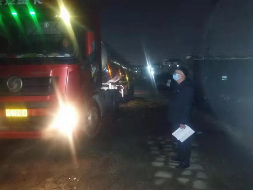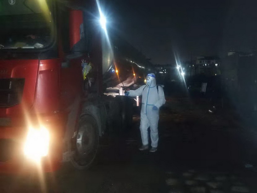在登記信息的過程中,公司紀檢專員孫健細心的發(fā)現(xiàn)駕駛?cè)藛T的不對勁,“師傅,您看起來很疲憊,是身體不舒服嗎?”“小伙子觀察真是細致,我只是太餓了,閉環(huán)管理規(guī)定駕駛員不準離車,所以我從鹽城出來4個多小時還沒有吃晚飯?!薄皫煾?,您稍等一下,我去給您買份快餐,再給您燒壺?zé)崴 碑?dāng)駕駛員吃完快餐,鈣液車也裝貨結(jié)束,此時已是晚上9點40分,按照“方案”規(guī)定,“大白”程輝對車輛進行離場消殺,并拍攝相應(yīng)消殺照片,上傳系統(tǒng)。