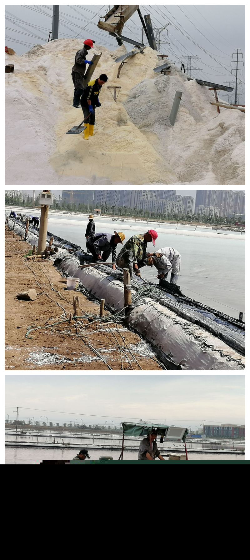 沒有參加扒鹽的人員也沒閑著,他們將工作重心轉(zhuǎn)移到苫布保鹽工作中來,苫鹽廩布、整理樁繩、修補(bǔ)、拉放塑布,對(duì)存鹽廩基等區(qū)域進(jìn)行疏通加固,以及扒鹽后有序推進(jìn)灘場(chǎng)文明等等。特別是東灘,為了盡早完成1680公畝的灌池任務(wù),至三月初以來,工人們起早貪黑、放棄節(jié)假日克服一切困難,經(jīng)過多方共同努力現(xiàn)已灌池1200多公畝,預(yù)估池內(nèi)長(zhǎng)鹽已達(dá)8000多噸。面對(duì)雨季即將到來之際,各單元在保證鹽色、鹽質(zhì)做好安全扒鹽的同時(shí),抓住晴好天氣強(qiáng)化大面積制鹵,加大走水深度和節(jié)制,充分利用蒸發(fā)量多制鹵、制好鹵為順利度過汛期做好一切準(zhǔn)備。