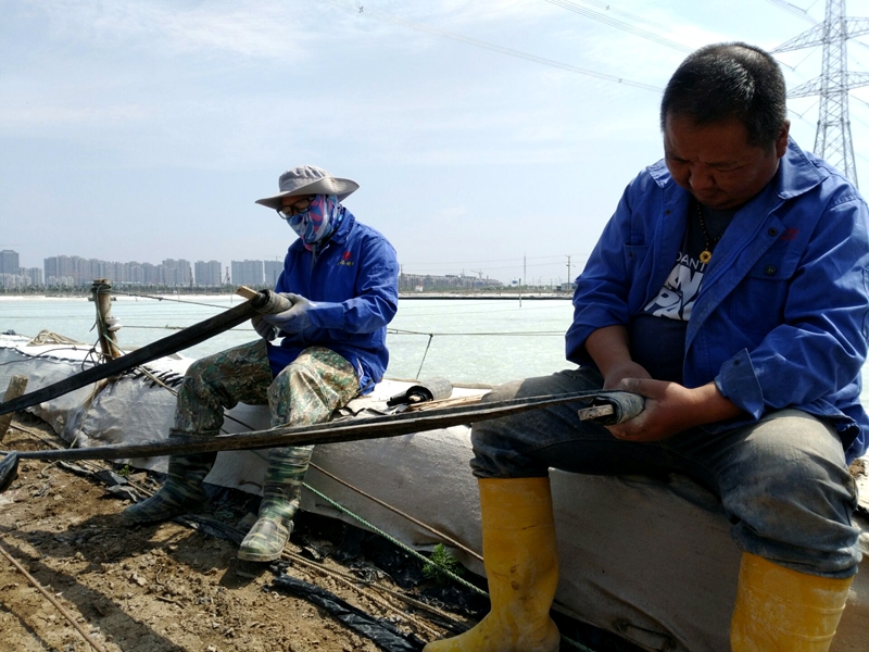 因礦鹽鹵水清,結晶速率快,在長鹽的過程中極易附著于浮板上,增加了浮板的重量,不利于浮板的漂浮,嚴重影響塑布的收放,急需將原1680公畝鈣鹽結晶池里的浮板進行更換,共28條,2800米。為了效益最大化、成本最小化,大浦工區(qū)回收3、4、14、15班已征結晶池的舊浮板進行晾曬,并利用廢舊的塑布進行同規(guī)格的裁剪包裹在浮板上,程序繁瑣,工作量巨大。東灘的15名員工加班加點,搶抓有利天時,確保雨季到來之前塑布收放正常,多產鹽、產好鹽,促進春曬制鹵確保原鹽生產良性運轉夯實基礎。