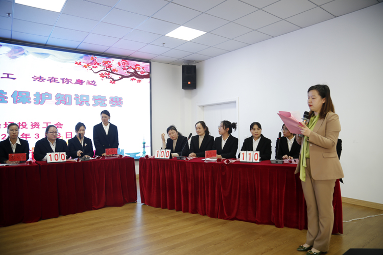 3月8日,投資公司工會在環(huán)衛(wèi)運營管理中以“情系女職工 法在你身邊”為主題,舉辦 “女職工權(quán)益保護”知識競賽。投資公司黨委書記、董事長、總經(jīng)理莊清付,黨委副書記、工會主席劉剛,副總經(jīng)理楊守明,各單位黨政工、工會女工委成員、悅升機關(guān)全體員工觀摩比賽。