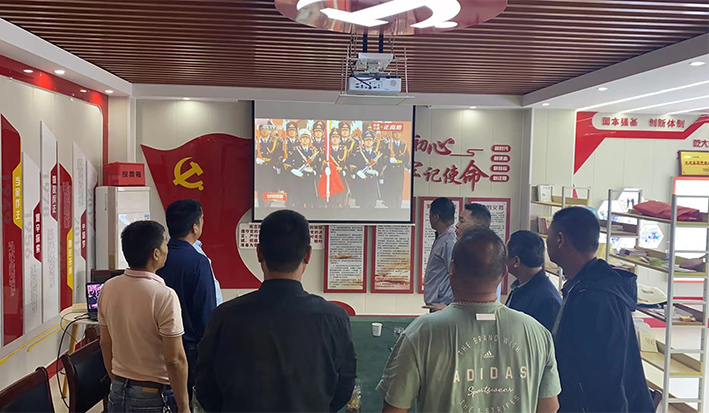 主題黨日活動在國歌中拉開了序幕。資產(chǎn)管理中心全體黨員列隊面向屏幕,觀看天安門廣場升國旗儀式視頻。