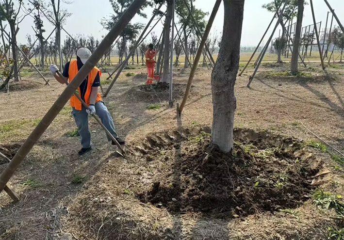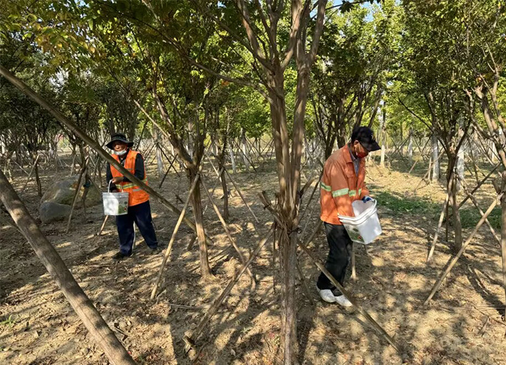 自十月中下旬以來(lái),班組全體成員積極準(zhǔn)備,做好抗旱保障工作。每天早晨7點(diǎn),兵分二路,按照各自分工迅速行動(dòng)起來(lái)。葛承東帶領(lǐng)一部分工人對(duì)櫻花林、紅梅林整理樹圍;田恒亮帶領(lǐng)一部分工人施肥澆水,有的同志拎小提桶施肥,有的拿自來(lái)水管在后面澆水。為保證水流進(jìn)樹木根系,工作人員采取多種方法讓葉片、根系喝足水。為堅(jiān)決打贏這場(chǎng)抗旱保樹木攻堅(jiān)戰(zhàn),綠化分公司在堅(jiān)持科學(xué)用水、節(jié)約用水的前提下,通過(guò)科學(xué)的修剪植物、抹芽,松土,除草等措施確保苗木安全度過(guò)干旱天氣。由于抗旱工作啟動(dòng)較早,措施得當(dāng),抗旱保苗工作已取得初步成效。目前為止,已經(jīng)完成7000余棵櫻花林和紅梅林的施肥、澆水工作。